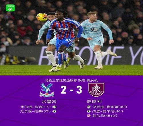 伯恩利客場(chǎng)32逆轉(zhuǎn)水晶宮,尤爾根拉森雙響難救主