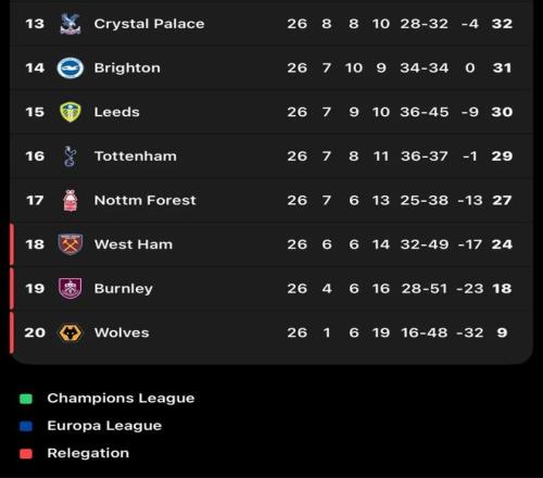 英超保級(jí)形勢(shì)驟變!五支球隊(duì)深陷降級(jí)區(qū)兩隊(duì)緊急換帥