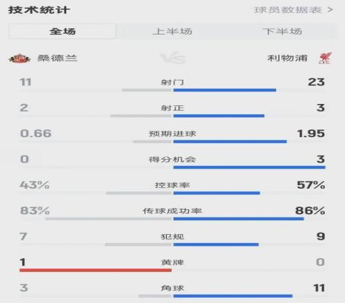 全場數(shù)據(jù)慘淡:控球率57%、射門23-11遙遙領(lǐng)先,但射正僅3次!預(yù)期進(jìn)球(xG)1.95卻只打入1球,甚至這唯一的進(jìn)球還是范戴克頭球反彈入網(wǎng),帶有極大的運(yùn)氣成分。