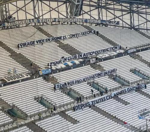 此外本場(chǎng)比賽還遭到了馬賽球迷的空?qǐng)觯ú糠挚磁_(tái))抗議,球迷橫幅上寫(xiě)道:“空空如也的看臺(tái)以示抗議,對(duì)于一個(gè)自我毀滅的俱樂(lè)部而言,你們所有的計(jì)劃都在這些荒廢的歲月中化為泡影”。