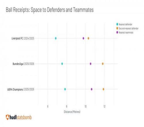 截至英超第23輪,利物浦左路場(chǎng)均突破從迪亞斯離隊(duì)前的11.2次降至7.5次,進(jìn)攻三區(qū)傳球成功率從81%跌至65%,造點(diǎn)僅2次,而迪亞斯本賽季在拜仁造點(diǎn)6次,成為德甲造點(diǎn)王。過往在利物浦迪亞斯并不是絕對(duì)核心,也不是絕對(duì)主力,單看數(shù)據(jù)他上賽季甚至不如“神秘內(nèi)切男”加克波,但失去迪亞斯的沖擊力導(dǎo)致利物浦的高位壓迫體系場(chǎng)均前場(chǎng)壓迫次數(shù)從18.5次降至15.2次,反擊機(jī)會(huì)減少35%。
