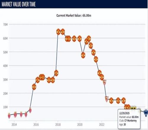 其中2015年6000萬買入的馬夏爾,堪稱是“古早版”失敗者。自摩納哥出道后他來到曼聯(lián)的,起初表現(xiàn)還算穩(wěn)定,到2018年前后身價到過6500萬的高度的。可遺憾的是之后他再無太好的機會,2020年前后則遭遇到了崩盤,身價一落千丈的。到2022年只有3000萬不到。