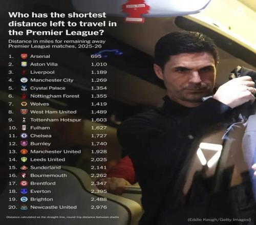 英超聯(lián)賽26輪戰(zhàn)罷,爭冠局勢將進(jìn)入白熱化階段。日前,The Athletic計算了英超各支球隊剩余聯(lián)賽賽程的客場旅程總距離,結(jié)果顯示阿森納是20支英超球隊中,本賽季剩余旅程最短的球隊。