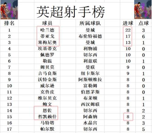 射手榜方面,哈蘭德22球繼續(xù)領(lǐng)跑,蒂亞戈5球之差位列第2,塞梅尼奧13球排在第3。哲凱賴什今天未能進(jìn)球,還是和沃特金斯,維爾貝克,恩佐,帕爾默等人8球剛好擠入前十。