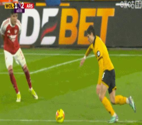 第90+3分鐘,加布里埃爾和拉亞配合失誤,卡拉菲奧里烏龍,狼隊2-2阿森納