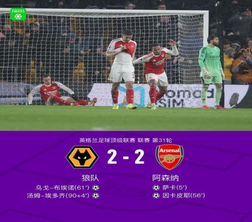 北京時間2月19日英格蘭足球頂級聯(lián)賽第31輪,狼隊主場對陣阿森納。上半場薩卡閃擊,馬丁內(nèi)利造險,下半場因卡皮耶?dāng)U大比分,布埃諾扳回一球,卡拉菲奧里烏龍。最終比分狼隊 2-2 阿森納。
