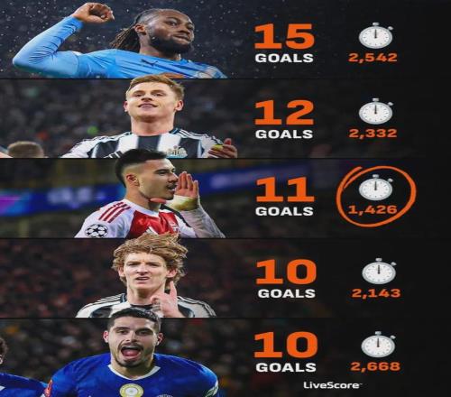 (對狼隊之前)數(shù)據(jù)統(tǒng)計,本賽季各項賽事打進10球以上的英超邊鋒中,馬丁內(nèi)利是用時最少、效率最高的。