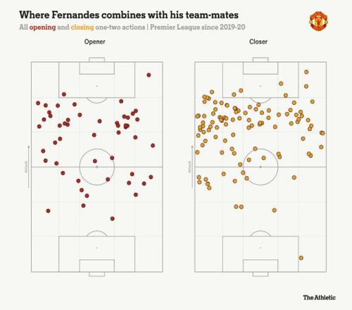 2019年8月以來,只有利物浦的安迪·羅伯遜和曼城的貝爾納多·席爾瓦進行的二過一配合次數(shù)比B費多。與B費默契最好的,是過去的拉什福德,以及如今的邊后衛(wèi)盧克·肖和迪奧古·達洛。
