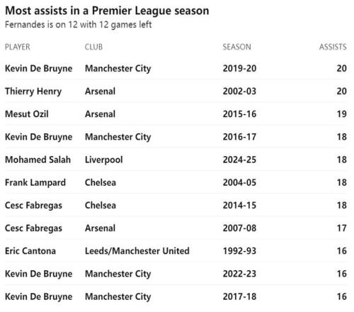 數(shù)據(jù)顯示,目前B費27輪英超12次助攻,還需要8次助攻,才能追平2002/03賽季阿森納的亨利,以及2019/20賽季的德布勞內(nèi)共同保持的英超單賽季20次助攻最高紀(jì)錄。