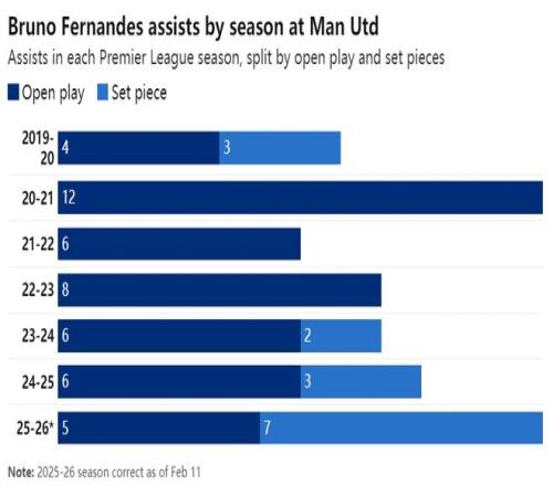 與個人巔峰時期相比,現(xiàn)在B費的直塞少了,但定位球助攻增加。2024年8月至今,他通過角球和任意球助攻10次,在聯(lián)盟中名列前茅。同期,他的運動戰(zhàn)助攻11次,二者幾乎平分秋色。