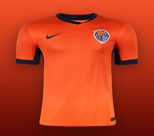 青島海牛主場(chǎng)球衣通過(guò)由隊(duì)徽向外延展的光影紋樣呈現(xiàn)速度與活力。亮橙色輔以深藍(lán)色點(diǎn)綴,視覺(jué)層次清晰而富有張力。