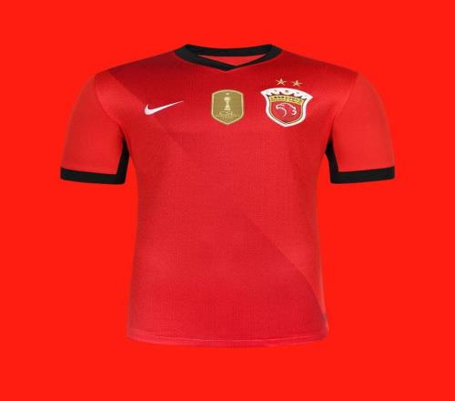 上海海港的新款主場(chǎng)球衣依以紅色作為主色調(diào),領(lǐng)子下方增加一枚金色盾牌。這個(gè)特別配飾是冠軍隊(duì)伍的象征,贊助商首次使用這種類型的設(shè)計(jì)。金色的盾牌中間有一個(gè)以中超冠軍獎(jiǎng)杯——火神杯為設(shè)計(jì)靈感的徽章,下面標(biāo)有奪冠年份,這是中超“冠軍配置”球衣。