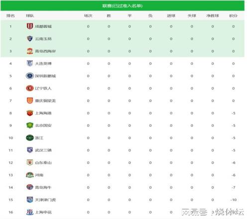 中超積分榜:申花津門虎10分墊底,長(zhǎng)春亞泰中甲4分墊底