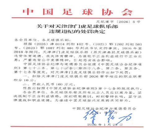 周四,中國足協(xié)正式公布受處罰俱樂部名單。天津津門虎被罰10分,王棟、鄧小飛則遭到終身禁足。