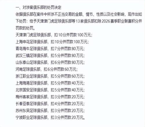 從這份公布的涉假球名單上來看,上海申花和天津津門虎是扣分最多的球隊,每一支球隊的扣分是10分,外加罰款100萬元,緊跟著是青島海牛扣7分,山東泰山、河南扣6分,武漢三鎮(zhèn)、上海海港、北京國安扣5分,梅州客家扣3分、長春亞泰扣4分外加罰款。