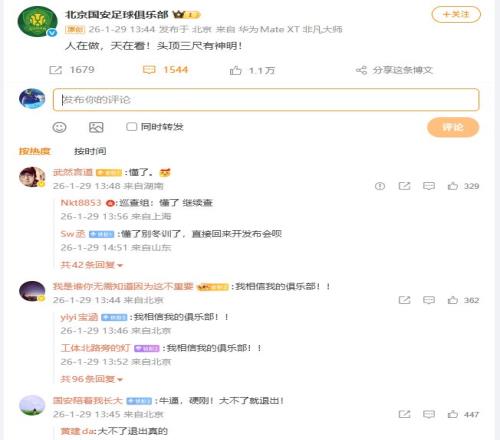 在沒有扣分之前,北京IP的球迷各處的嘲笑別的球隊是假球隊,不曾想自家球隊也被扣分了。然而,北京國安不服氣,球隊更是發(fā)文“人在做,天在看,頭頂三尺有神明!”