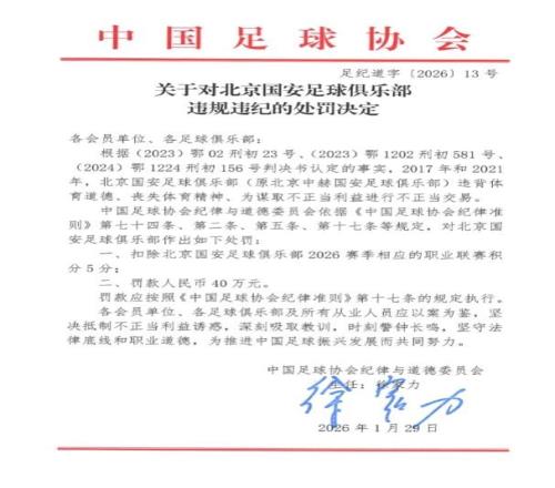 被扣5分+罰40萬!國安官微硬剛足協(xié):人在做天在看,球迷支持上訴