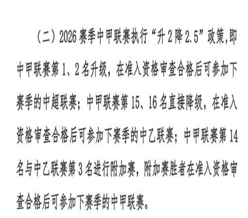 中甲聯(lián)賽3月14日開賽,新賽季升級政策不變,還是前兩名獲得中超資格。降級政策發(fā)生變化,中甲聯(lián)賽后兩名直接降級,第14名將與中乙聯(lián)賽第3名進(jìn)行附加賽,競爭更為激烈。中乙聯(lián)賽3月21日開賽,新賽季后4名球隊直接降級,這一政策沒有變化。升級層面,中乙前兩名獲得中甲資格,第三名獲得沖甲附加賽資格,這對中乙參賽隊來說是個好消息。