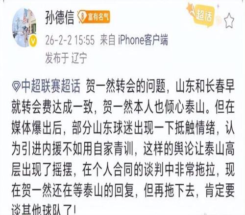 不過,計劃趕不上變化。就在大家以為這樁轉(zhuǎn)會交易板上釘釘?shù)臅r候,近期有博主卻爆料賀一然的轉(zhuǎn)會陷入了停滯。原來,不少山東泰山球迷認為,與其引進賀一然,不如重點培養(yǎng)自家的青訓(xùn)球員,只要給予充足出場機會,史松宸的實力未必不及賀一然。受這種外部輿論影響,泰山俱樂部在引援決策上開始陷入搖擺狀態(tài):一方面,后防線的困境迫切需要引援補強,賀一然的能力與潛力符合球隊需求;另一方面,外部球迷情緒、過往多筆引援失敗帶來的輿論壓力,讓俱樂部高層顧慮重重、猶豫不決。