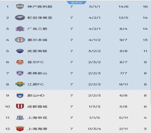 7輪過后的積分榜,由于本輪均未取勝,3支中超球隊仍舊牢牢占據(jù)著倒數(shù)3個位置。成都蓉城積6分排在倒數(shù)第3,申花僅有4分排倒數(shù)第2,上港則繼續(xù)排名墊底。其中,兩支上海球隊與第8名的分差已經(jīng)超過3分,在聯(lián)賽階段僅剩1輪的情況下已無法躋身晉級區(qū),提前1輪被淘汰出局。