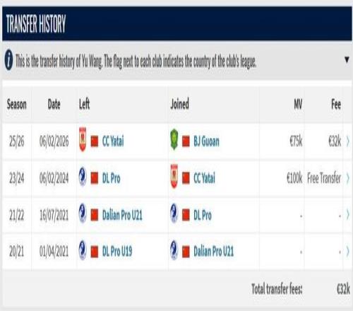 據(jù)德轉(zhuǎn)信息顯示,王禹今年冬窗從長春亞泰加盟北京國安的轉(zhuǎn)會費為3.2萬歐元(約合人民幣26萬元)。
