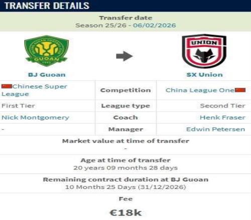 德轉(zhuǎn):王宇翔從北京國安加盟陜西聯(lián)合的轉(zhuǎn)會費約15萬人民幣