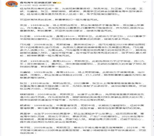 青島海牛大年初一官宣十將!北京時(shí)間2月17日上午,青島海牛俱樂部官宣,宋龍、孫正傲、鄺兆鐳、王嶠、劉鑫瑜、張衛(wèi)、穆斯塔帕、顏?zhàn)勘颉切怯钷D(zhuǎn)會(huì)加盟俱樂部,韋子弦租借加盟。