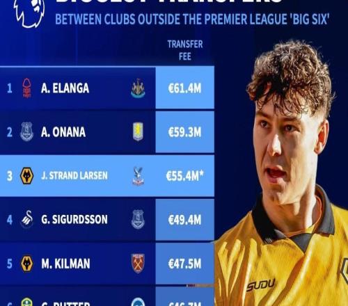 德轉統(tǒng)計英超除BIG6外歷史最貴交易:紐卡6140萬歐簽埃蘭加第1
