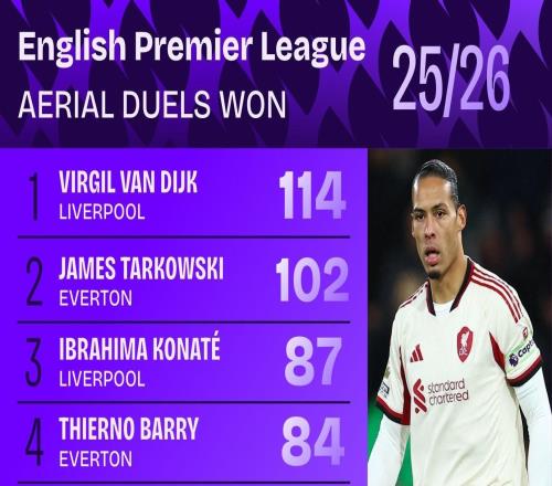 本賽季英超贏得空中對(duì)抗排名:范戴克第一,塔爾科夫斯基次席