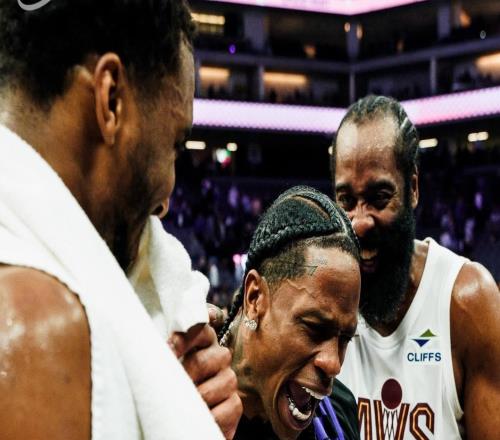 TravisScott現(xiàn)場觀戰(zhàn)哈登騎士首秀,兩人賽后激情相擁