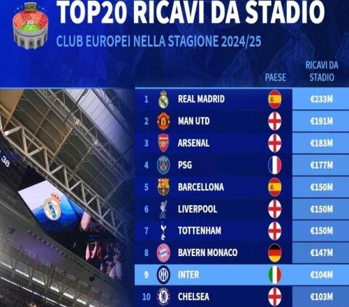 北京時間2月17日,德轉(zhuǎn)統(tǒng)計出2024-25賽季歐洲球場門票收入最高的20家俱樂部,皇家馬德里以2.33億歐元高居第一,曼...