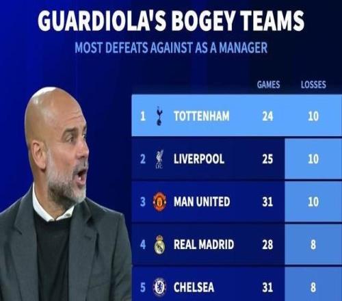 24戰(zhàn)10負(fù),熱刺是瓜迪奧拉教練生涯至今輸球場(chǎng)次最多的對(duì)手