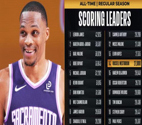 國(guó)王墊底了,威少卻還在打,他用17分換來(lái)了27000分里程碑