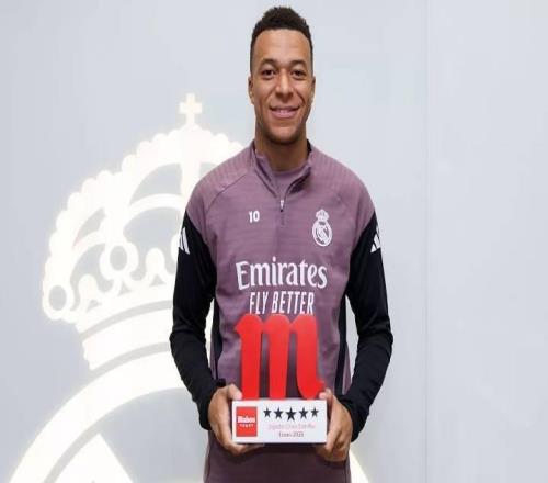 榮耀時刻,姆巴佩在訓(xùn)練基地領(lǐng)取了皇馬1月最佳球員獎杯