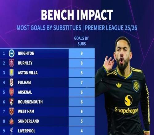 本賽季英超球隊(duì)替補(bǔ)進(jìn)球榜:布萊頓9球第1,曼城、曼聯(lián)1球墊底