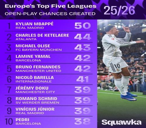 姆巴佩本賽季至今運(yùn)動(dòng)戰(zhàn)創(chuàng)造50次機(jī)會(huì),為五大聯(lián)賽首人