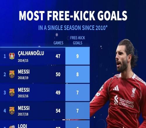 2010年以來單賽季任意球進球榜:梅西三度上榜,索博4球第22