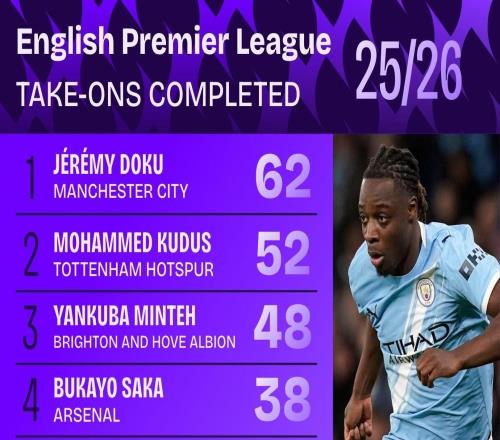 本賽季英超成功過人排名:多庫62次居首,庫杜斯次席