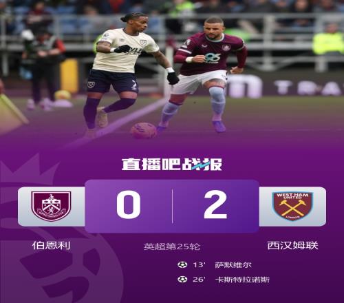伯恩利慘遭西漢姆聯(lián)連擊16輪未嘗勝果薩默維爾卡斯特拉諾斯進(jìn)球扳回一城_英超直播