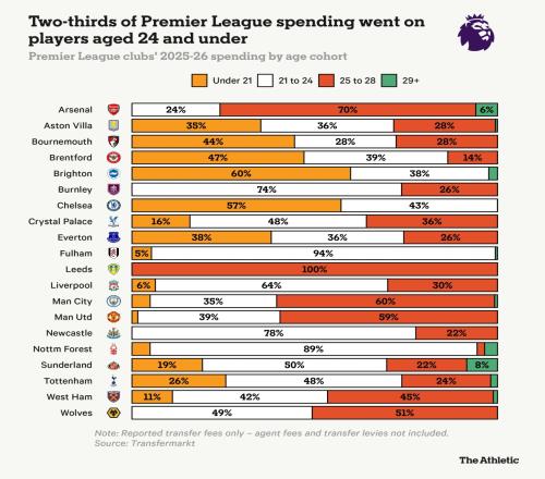 英超球隊(duì)近一半轉(zhuǎn)會(huì)資金流向21至24歲年輕球員_英超直播