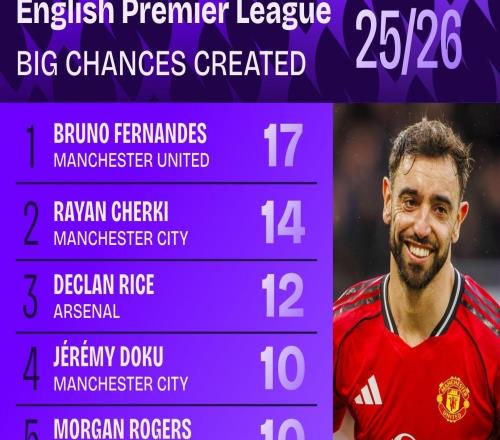 英超創(chuàng)造重大機(jī)會(huì)榜:B費(fèi)17次領(lǐng)跑,謝爾基14次、賴(lài)斯12次