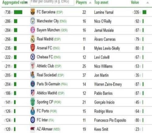 CIES青訓(xùn)球員身價(jià)榜:巴薩7.38億歐斷層領(lǐng)先,曼城2.84億第二