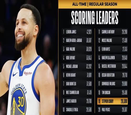 超越保羅皮爾斯,庫(kù)里生涯總得分升至NBA歷史第19位